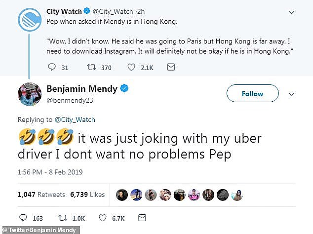 The France international currently still injured despite a return to first-team action in January was given permission to fly to Paris for the day by manager Pep Guardiola. Manchester Citys Benjamin Mendy tagged himself en route to Hong Kong but then said it was a joke Instagram benmendy23. Pep when asked if Mendy is in Hong Kong.